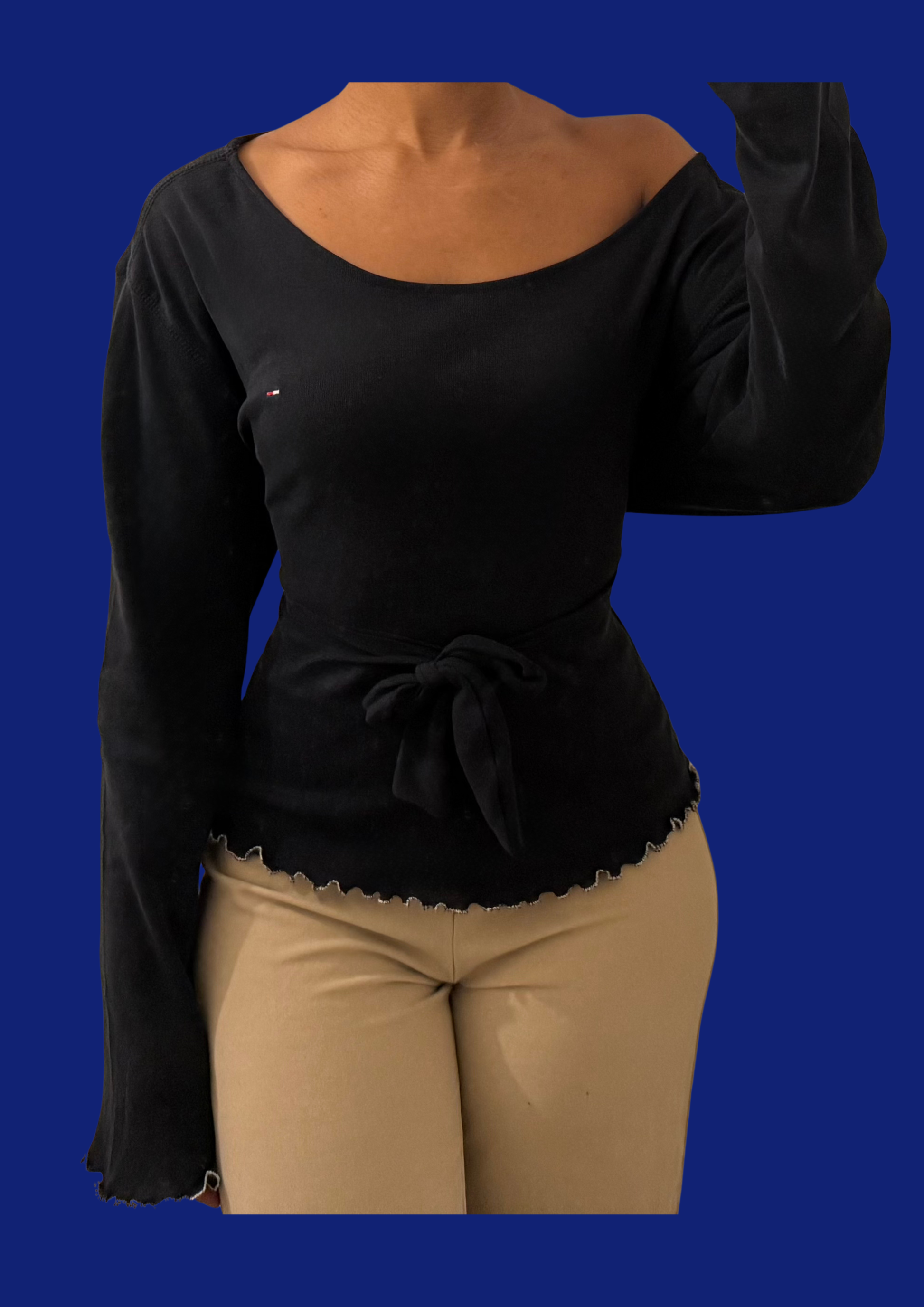 Ce t-shirt noir upcyclé est conçu à partir d’un t-shirt Tommy Hilfiger authentique, pour un style saisonnale. Sa coupe ajustable dans le dos s’adapte parfaitement à ta silhouette et convient aux tailles allant de XS à M.